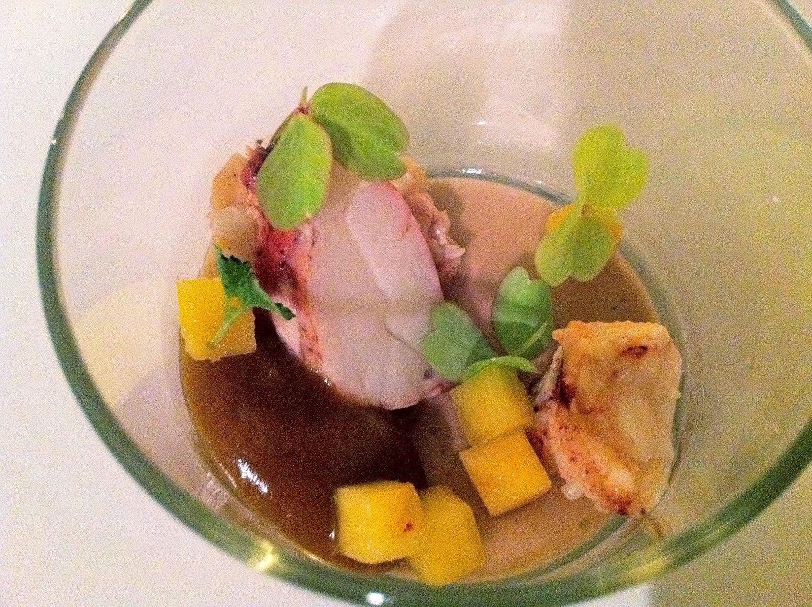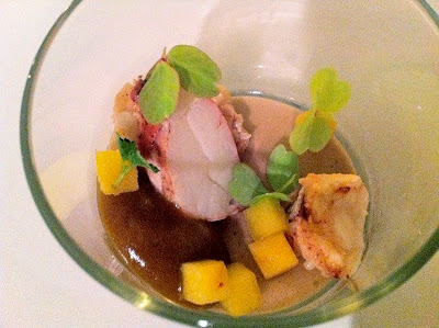 Course 2: langoustine, with flavors of shrimp cocktail – namely ketchup, lemon, and horseradish. It was just a couple of small, delicious bites.