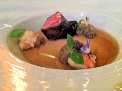 Course 5: lobster. More accurately, this was a rich, luscious foie gras mousse topped with Sauternes gelée and diced peaches, with lobster on top.