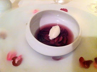 Course 14: a “surprise” dessert in more ways than one – not on the menu, and served with a theatrical flourish. First, we were presented with bowls containing rose petals and some twigs. Then, we were instructed to pour the contents of small pitchers into the bowls, activating the dry ice secreted beneath the petals and producing dramatic, billowing clouds seemingly out of nowhere. A bowl of jellied cherries was placed on top – a sort of old-fashioned and altogether lovely dish.