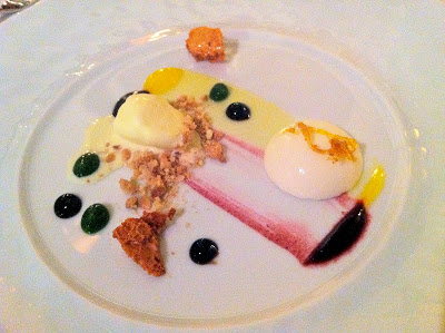 Course 15: huckleberries, served with olive oil ice cream and a panna cotta, along with dots of basil and honey “chips” – light and summery.